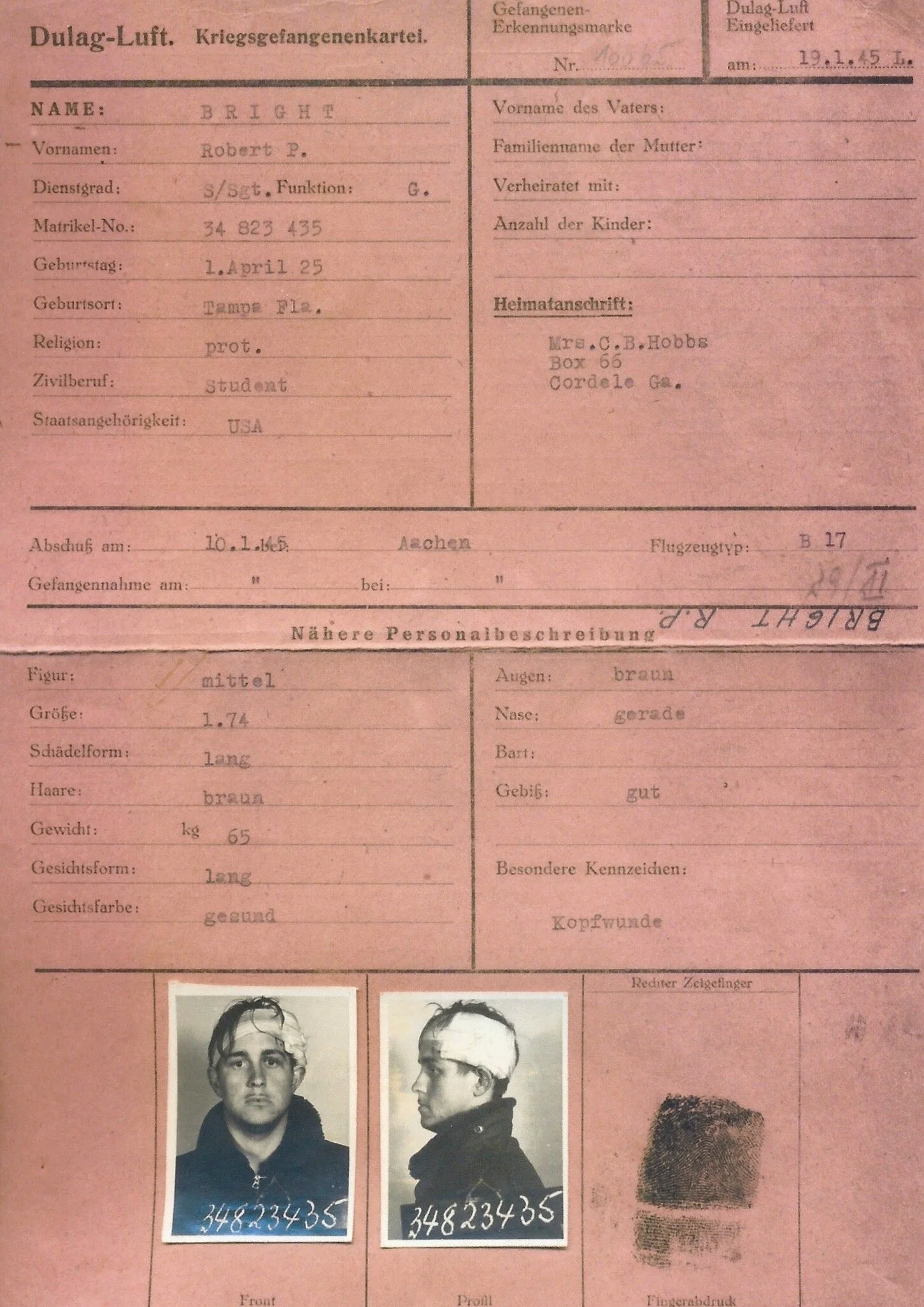 All 95th Bomb Group combat missions were flown over the German homeland or Occupied Europe. On every mission, every man faced the possibility of being shot down and captured. All the bomber & fighter groups in the 8th Air Force took photos of flying personnel to be carried with each airman on combat missions so that, should they be shot down, the photo[s] could be shared with the underground for use in forging papers & passports.